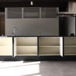 天井の梁、大きな照明器具、キッチン周りもすべてダークトーンで統一。外観と内観に一貫性をもたせシンプルだが大胆なデザイン。全体としてシャープで個性的な印象を与える家になりました。
